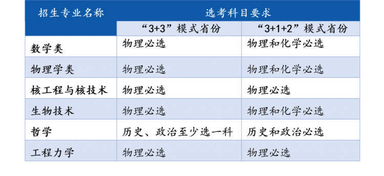 招生专业: 数学类、物理学类、生物技术、哲学、核工程与核技术、工程力学。在非高考综合改革省份,哲学专业招收文科生,其他专业招收理科生。对实行高考综合改革省份的考生,选考科目须满足以下要求: