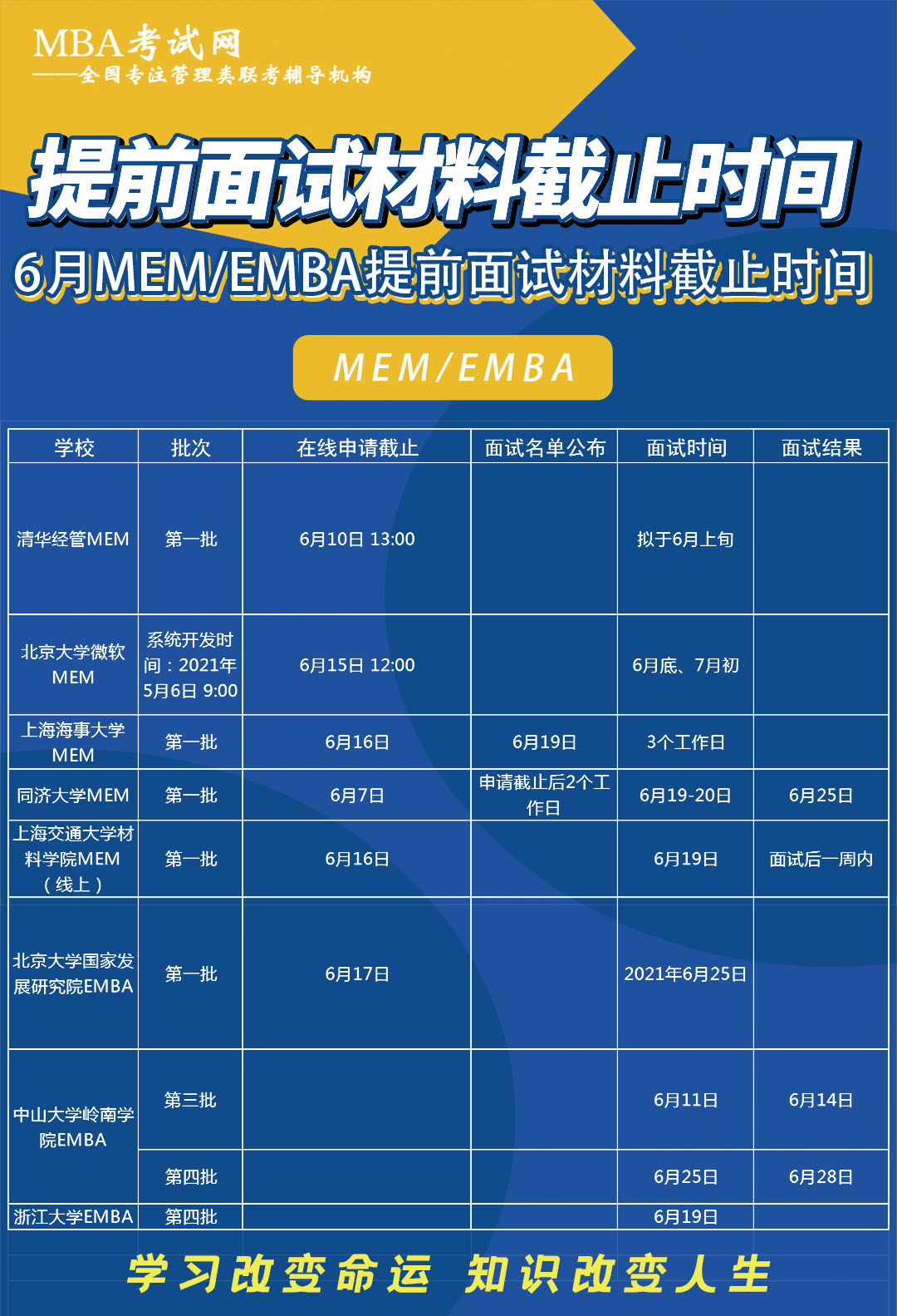 准备考MEM/EMBA的考生,建议大家一定要参加提前面试,现将2022入学提面信息本月提交材料截止时间汇总如下: