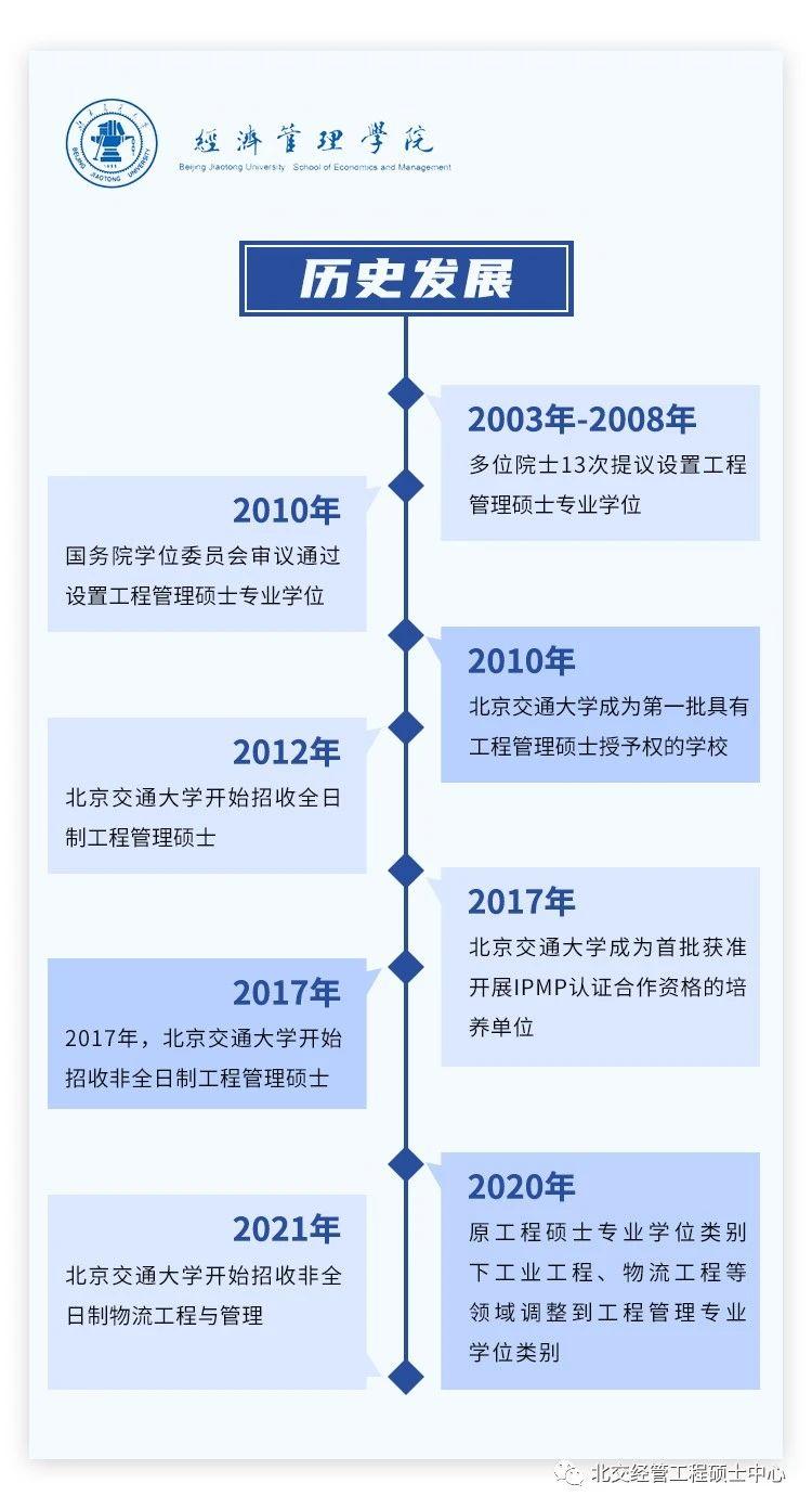 北京交通大学经济管理学院工程管理硕士(MEM)01MEM包含哪些专业工程管理硕士招生领域变革——在工程管理专业学位类别下设置“工程管理”(代码:125601),“项目管理”(代码:125602),“工业工程与管理”(代码:125603)、“物流工程与管理”(代码:125604)四个招生领域。02MEM是学历教育MEM是2010年国务院学位委员会审议通过设置的双证硕士专业学位项目,规定年限内完成相关课程修满学分,并通过毕业论文答辩,经学校审核批准后,颁发研究生毕业证书和学位证书。03MEM是交叉学科MEM是工程技术与管理的交叉复合性学科,旨在适应我国现代工程事业的发展对工程管理人才的迫切需求,培养能够独立担负工程管理工作的高层次、应用型工程管理专门人才。04适合有技术背景的管理者