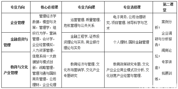 1.企业管理;2.金融投资与管理;3.教育与文化产业管理。本年度计划招生58人。(具体招生人数以我校研究生院最后确认招生指标为准)