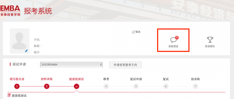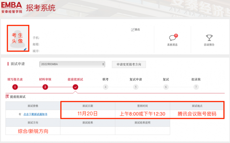 根据上海市和上海交通大学疫情防控相关通知精神并结合国内疫情发展态势,为了保障广大考生和在校师生的身体健康以及校园环境的安全有序,同时确保面试工作平稳顺利进行,2022年入学上海交大安泰EMBA项目11月20日提前批面试将使用腾讯会议平台进行在线视频面试。详细流程介绍如下,请各位考生知悉。视频讲解可以点击下方链接观看。