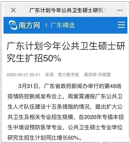 扩招的原因大家肯定都可以猜到,当然是因为受到此次疫情的影响。可能也是基于这个原因广东出台加强公共卫生人才建设的15条措施中,明确表示公共卫生专业硕士专业学位研究生几乎增长50%。